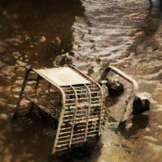 Bottle, bag and wood in river near Queenborough, Isle of Sheppey